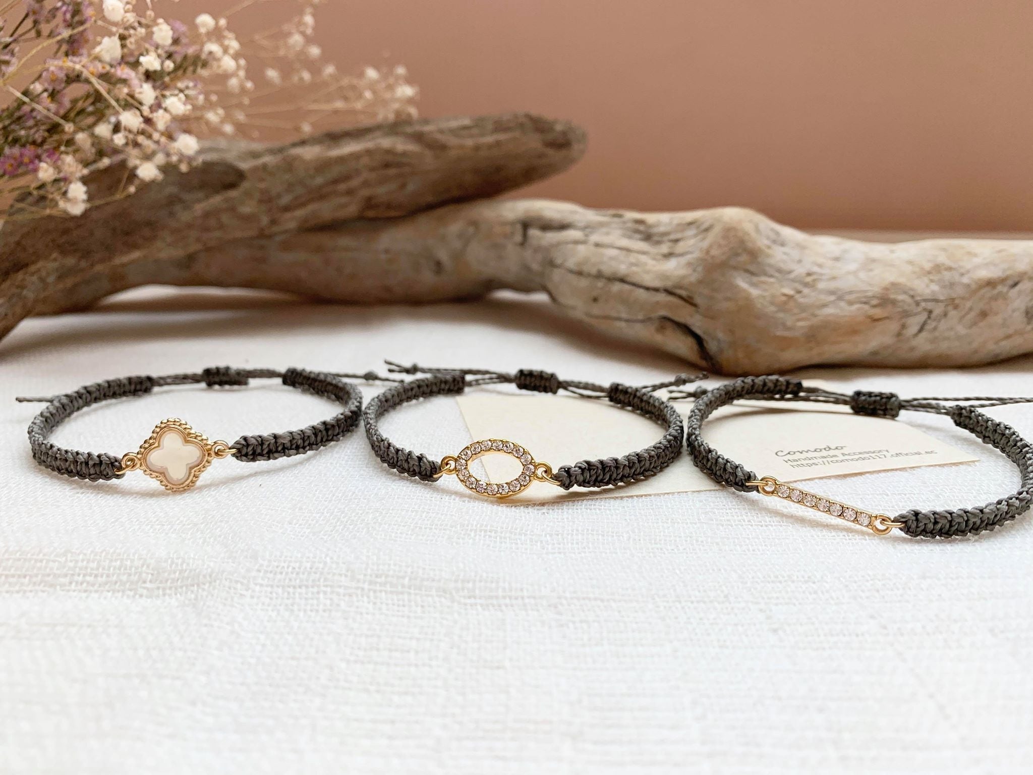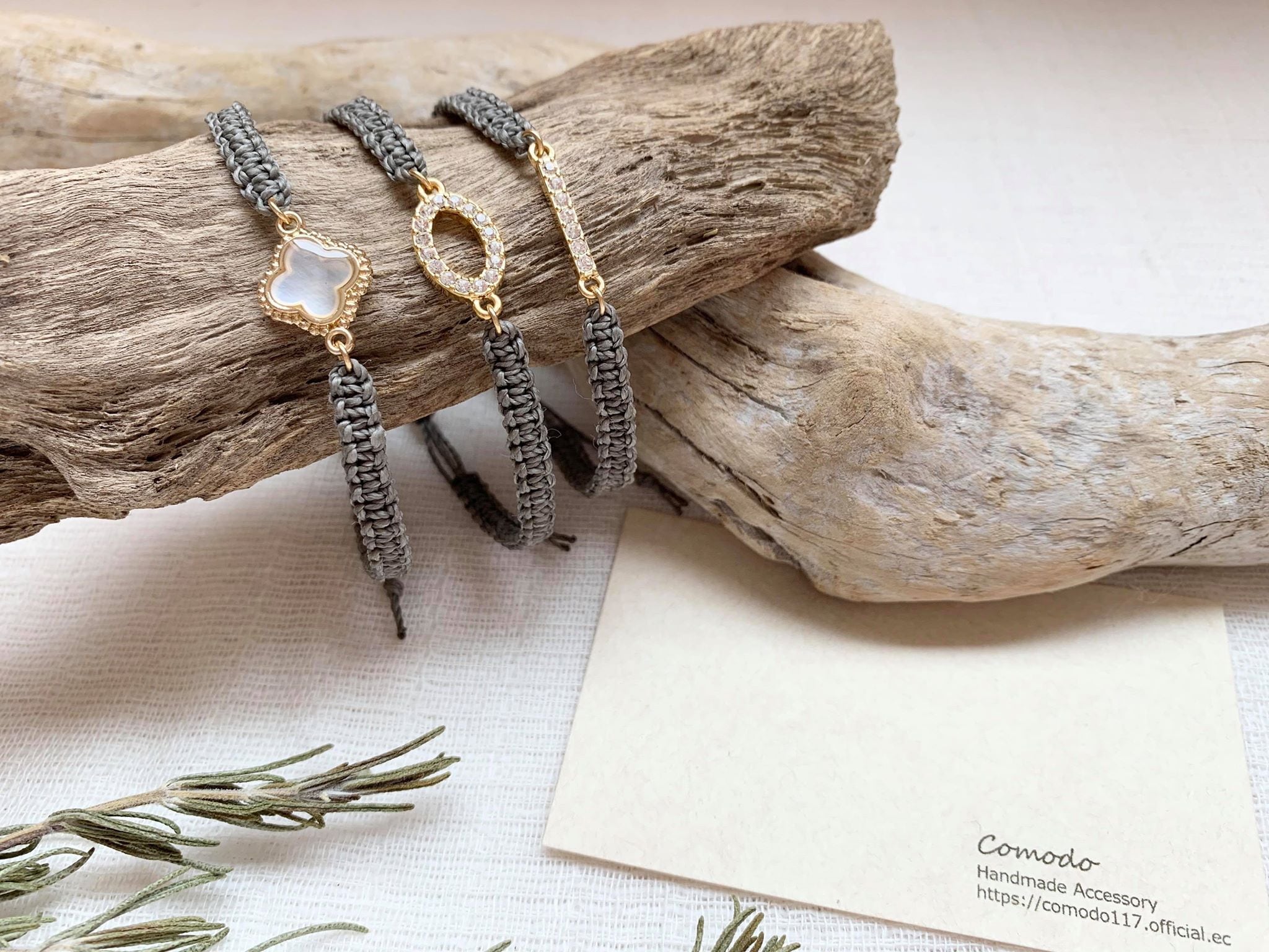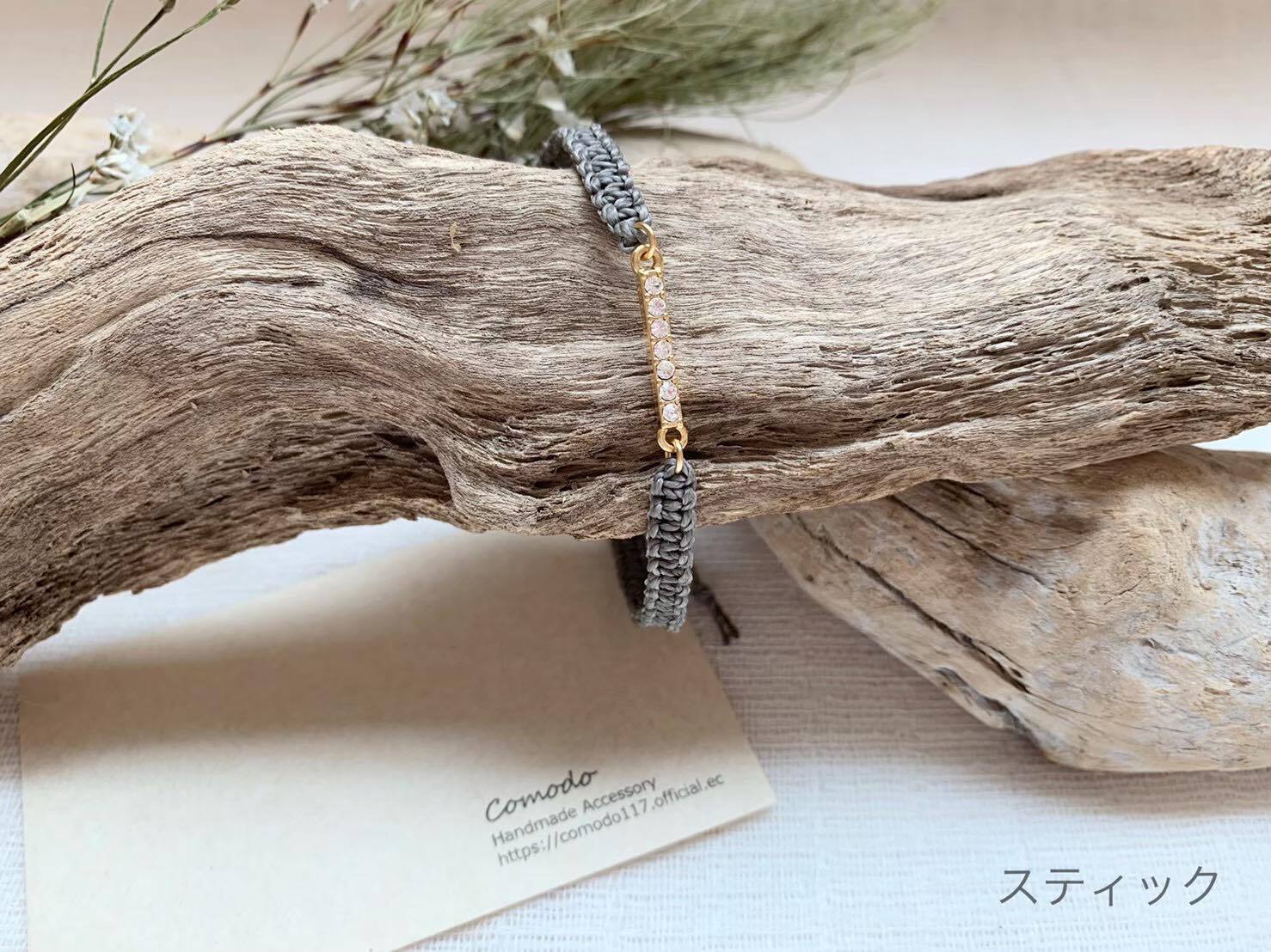 肌なじみの良いグレー色のブラジル製ワックスコードと人気のパーツを組み合わせて、ひとつひとつ丁寧に編みあげました。